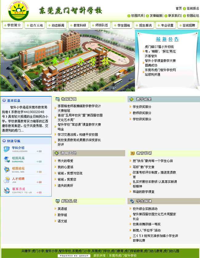 学校从2002年创校至今,一直坚持“以德治校,育人为本”的办学理念,围绕“德育为首,五育并举”目标,狠抓“三风的建设”(勤奋、诚实、好学、善思”的校风;“敬业、爱生、严谨、善教”的教风,“认真、好问、精思、乐学的学风)。学校几年来一直把教学质量作为强校之本,严格按照国家课程设置要求开足开齐课程,以安全为龙头,以德育为核心,以教学为主线,以第二课堂为特色扎实开展教育教学工作。由于智升小学内强管理,外树形象,在近年来各级各类比赛中,师生获奖捷报频传,在历届的全镇毕业会考中,学生成绩骄人,虎门智升学校的工作得到上级主管部门和广大家长一致首肯。